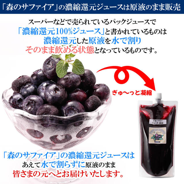 この3つの理由により、「森のサファイア」の濃縮還元ブルーベリージュースは原液のまま皆さまのもとへお届けいたします。