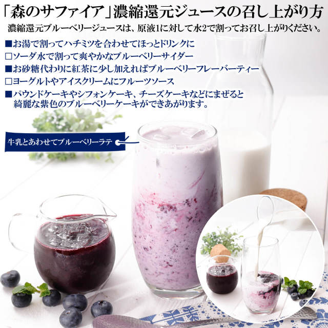 「森のサファイア」濃縮還元ブルーベリージュースは、原液1に対して水2で割ってお召し上がりください。濃いめが良い、薄めが良いという好みに合わせてバランスは調整していただけます。